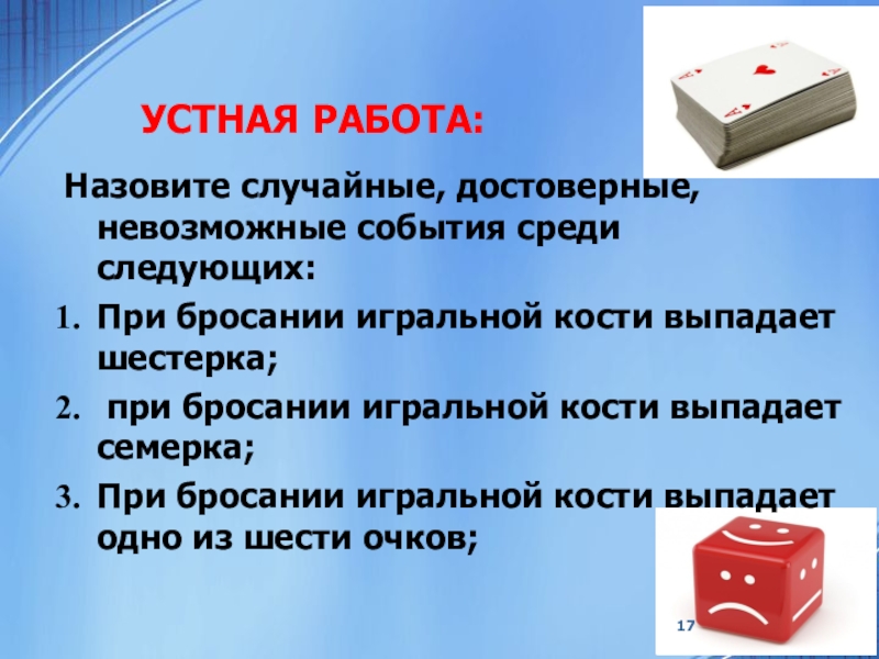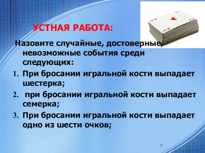 УСТНАЯ РАБОТА:Назовите случайные, достоверные, невозможные события среди следующих:4. При бросании игральной кости выпадает нечетное число очков.