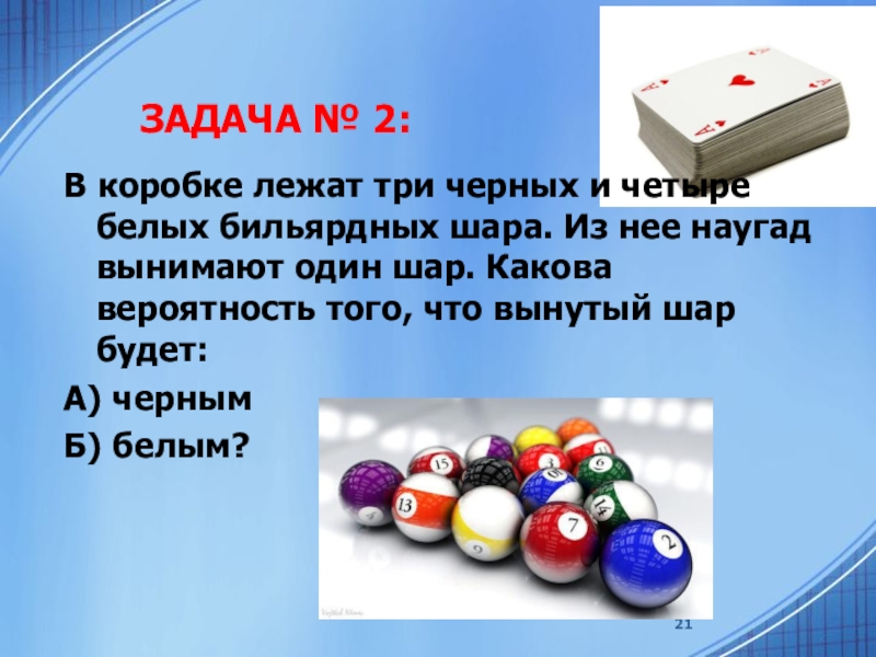 ЗАДАЧА № 2:В коробке лежат три черных и четыре белых бильярдных шара. Из нее наугад вынимают один