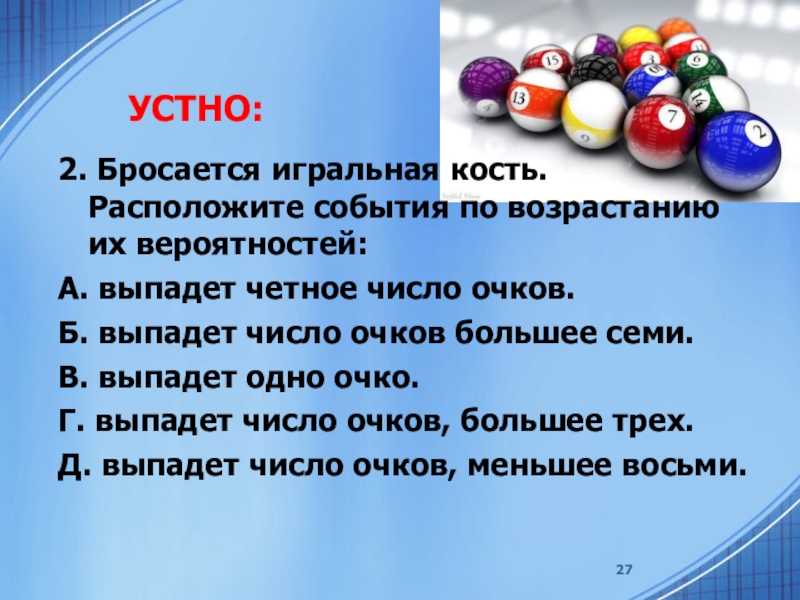 УСТНО:2. Бросается игральная кость. Расположите события по возрастанию их вероятностей:А. выпадет четное число очков.Б. выпадет число очков