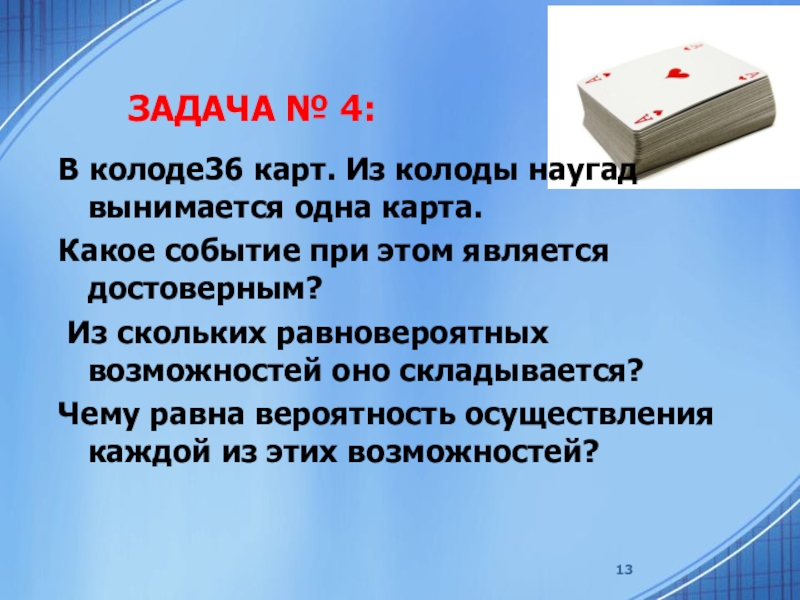 ЗАДАЧА № 4:В колоде36 карт. Из колоды наугад вынимается одна карта. Какое событие при этом является достоверным?