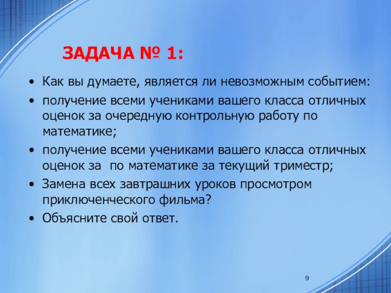 ЗАДАЧА № 1:Как вы думаете, является ли невозможным событием:получение всеми учениками вашего класса отличных оценок за очередную