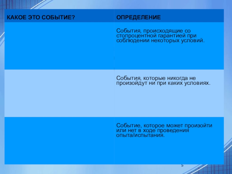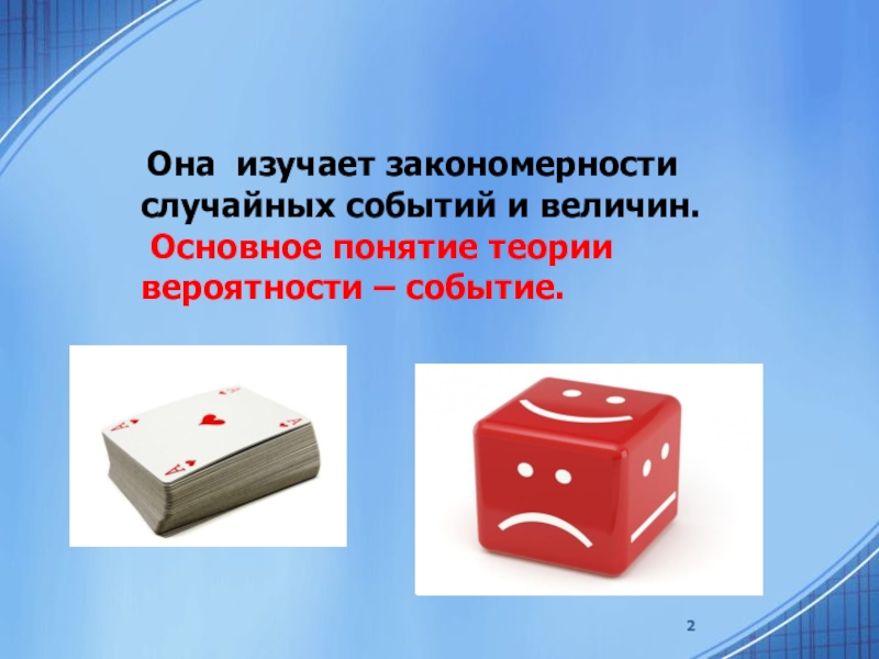 Она изучает закономерности случайных событий и величин. Основное понятие теории вероятности – событие.