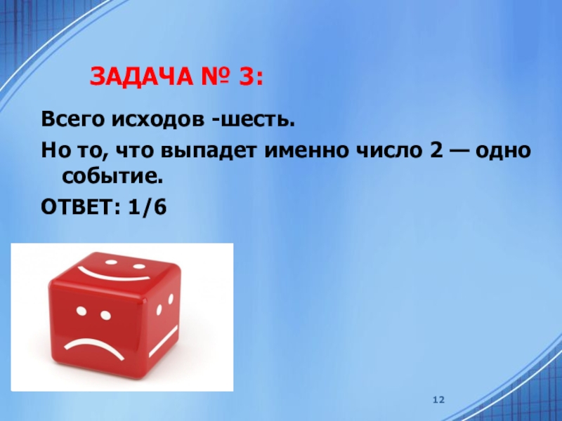 ЗАДАЧА № 3:Всего исходов -шесть.Но то, что выпадет именно число 2 — одно событие.ОТВЕТ: 1/6