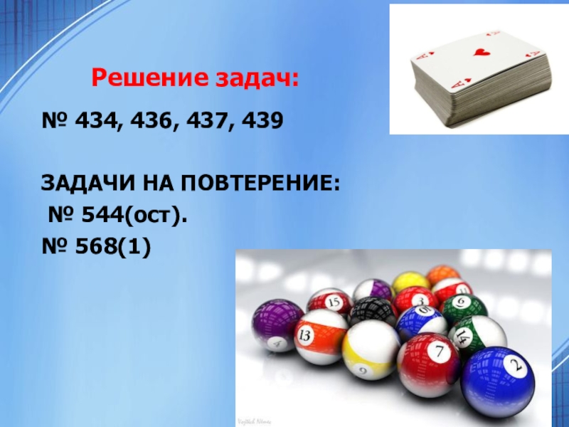 Решение задач:№ 434, 436, 437, 439ЗАДАЧИ НА ПОВТЕРЕНИЕ: № 544(ост).№ 568(1)