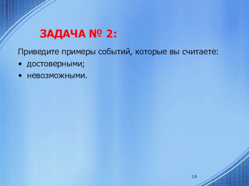 ЗАДАЧА № 2:Приведите примеры событий, которые вы считаете:достоверными;невозможными.