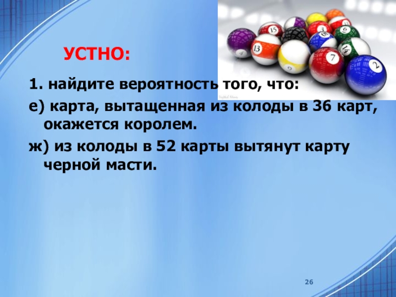 УСТНО:1. найдите вероятность того, что:е) карта, вытащенная из колоды в 36 карт, окажется королем.ж) из колоды в