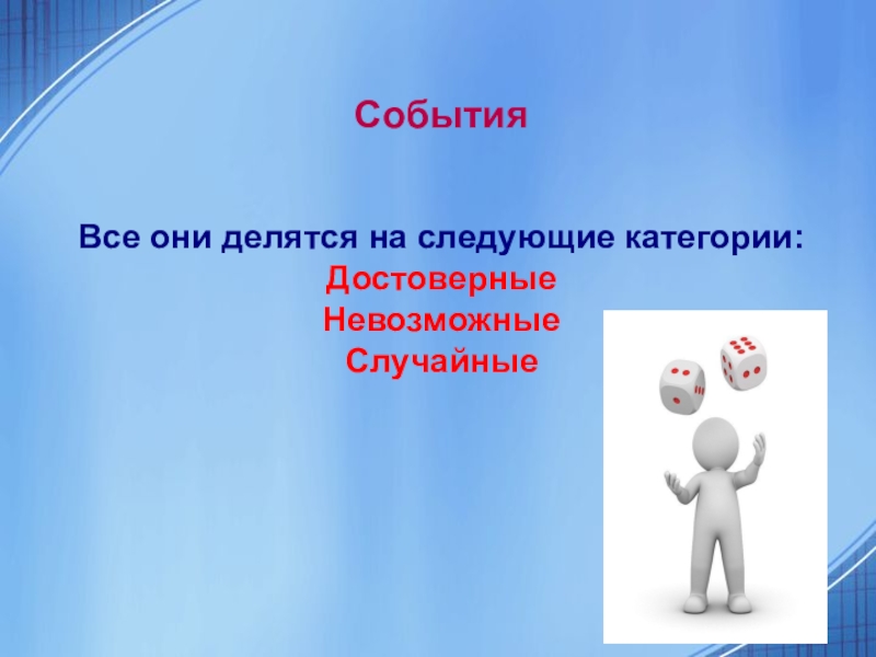УСТНАЯ РАБОТА:Назовите случайные, достоверные, невозможные события среди следующих:При бросании игральной кости выпадает шестерка; при бросании игральной кости