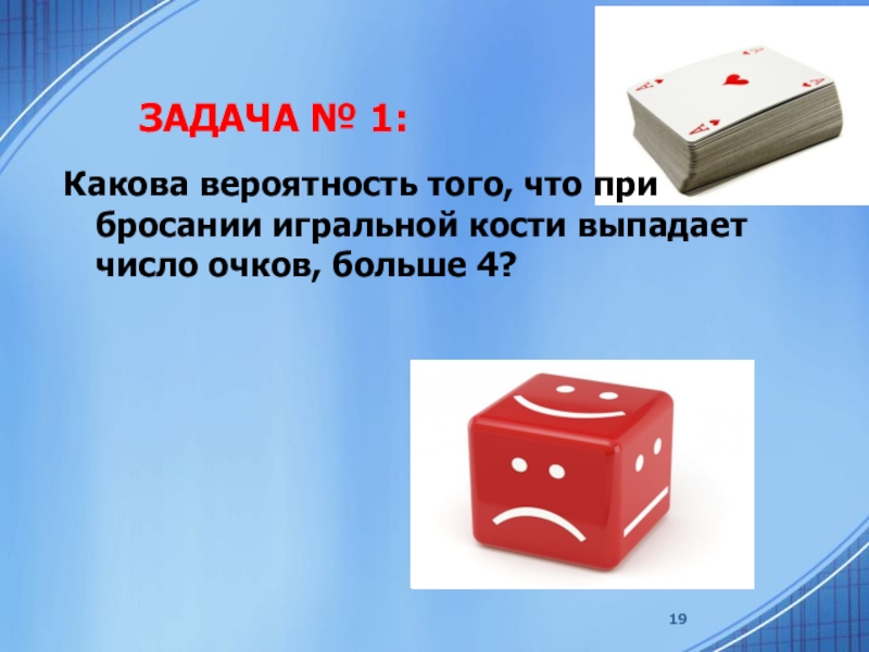ЗАДАЧА № 1:Какова вероятность того, что при бросании игральной кости выпадает число очков, больше 4?