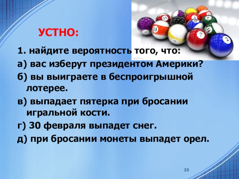 УСТНО:1. найдите вероятность того, что:а) вас изберут президентом Америки?б) вы выиграете в беспроигрышной лотерее.в) выпадает пятерка при
