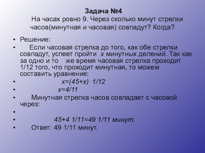 Если часовая стрелка до того, как обе стрелки совпадут, успеет пройти x минутных делений. Так как за одно и то же время часовая стрелка проходит 1/12 того, что проходит минутная, то можем составить уравнение: