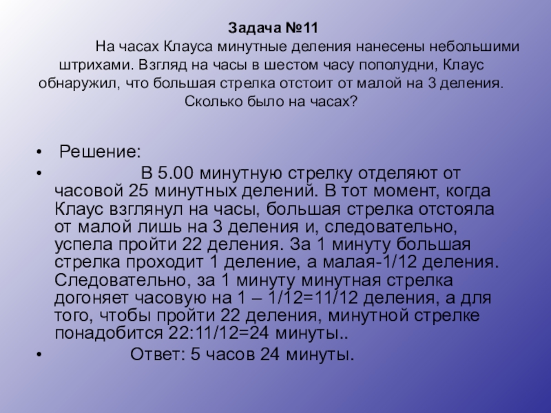 В 5.00 минутную стрелку отделяют от часовой 25 минутных делений. В тот момент, когда Клаус взглянул на часы, большая стрелка отстояла от малой лишь на 3 деления и, следовательно, успела пройти 22 деления. За 1 минуту большая стрелка проходит 1 деление, а малая-1/12 деления. Следовательно, за 1 минуту минутная стрелка догоняет часовую на 1 – 1/12=11/12 деления, а для того, чтобы пройти 22 деления, минутной стрелке понадобится 22:11/12=24 минуты..