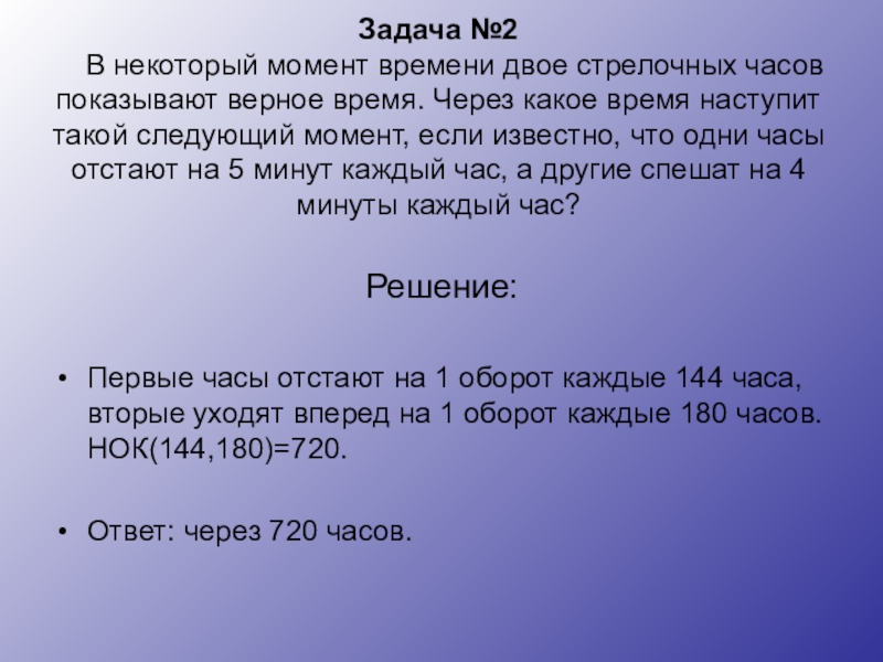 Первые часы отстают на 1 оборот каждые 144 часа, вторые уходят вперед на 1 оборот каждые 180 часов. НОК(144,180)=720.