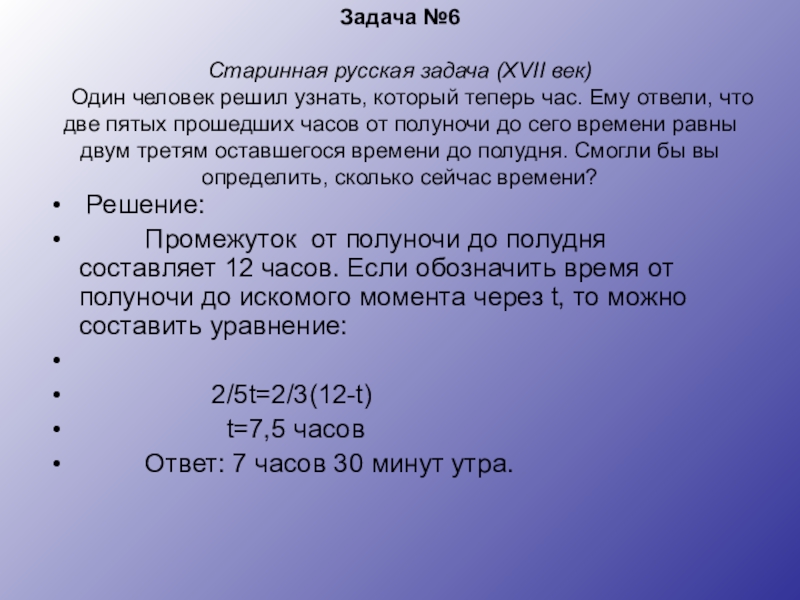 Промежуток от полуночи до полудня составляет 12 часов. Если обозначить время от полуночи до искомого момента через t, то можно составить уравнение: