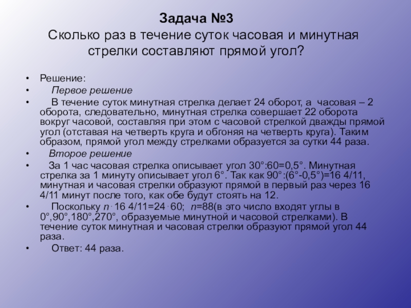 В течение суток минутная стрелка делает 24 оборот, а часовая – 2 оборота, следовательно, минутная стрелка совершает 22 оборота вокруг часовой, составляя при этом с часовой стрелкой дважды прямой угол (отставая на четверть круга и обгоняя на четверть круга). Таким образом, прямой угол между стрелками образуется за сутки 44 раза.