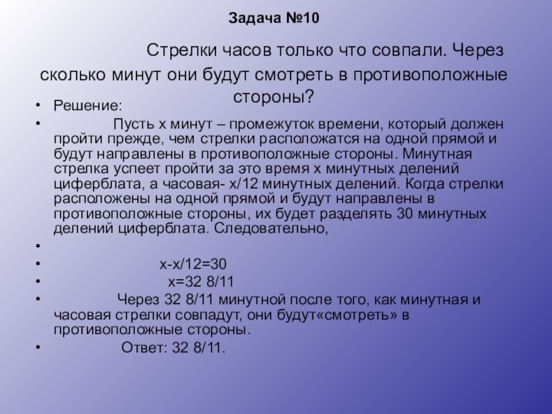 Пусть x минут – промежуток времени, который должен пройти прежде, чем стрелки расположатся на одной прямой и будут направлены в противоположные стороны. Минутная стрелка успеет пройти за это время x минутных делений циферблата, а часовая- x/12 минутных делений. Когда стрелки расположены на одной прямой и будут направлены в противоположные стороны, их будет разделять 30 минутных делений циферблата. Следовательно,
