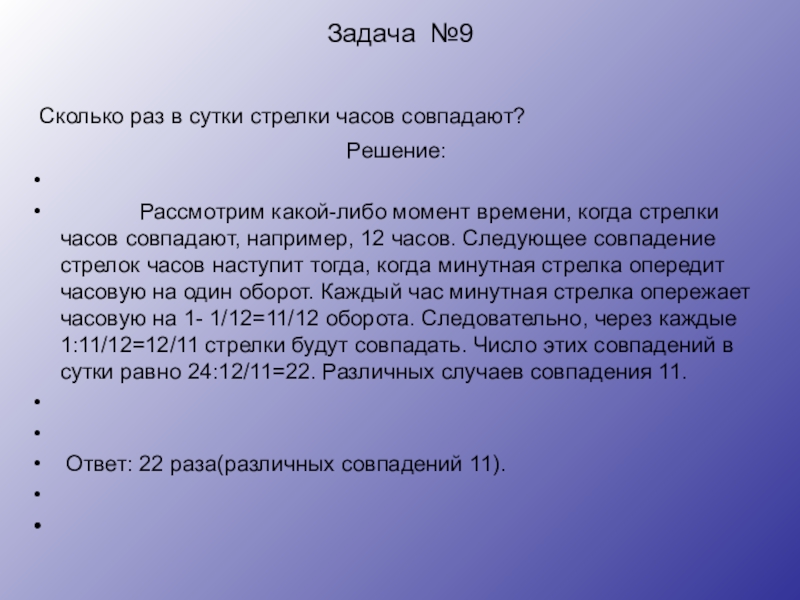 В полночь стрелки совпадают. Если пустить часы назад, то стрелки будут показывать какое-то вчерашнее время, а их расположение будет зеркально
