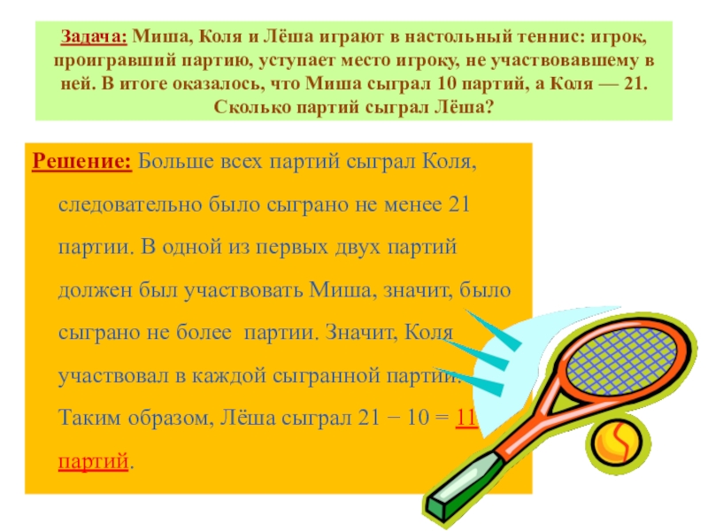 Решение: Больше всех партий сыграл Коля, следовательно было сыграно не менее 21 партии. В одной из первых двух партий должен был участвовать Миша, значит, было сыграно не более партии. Значит, Коля участвовал в каждой сыгранной партии. Таким образом, Лёша сыграл 21 − 10 = 11 партий.