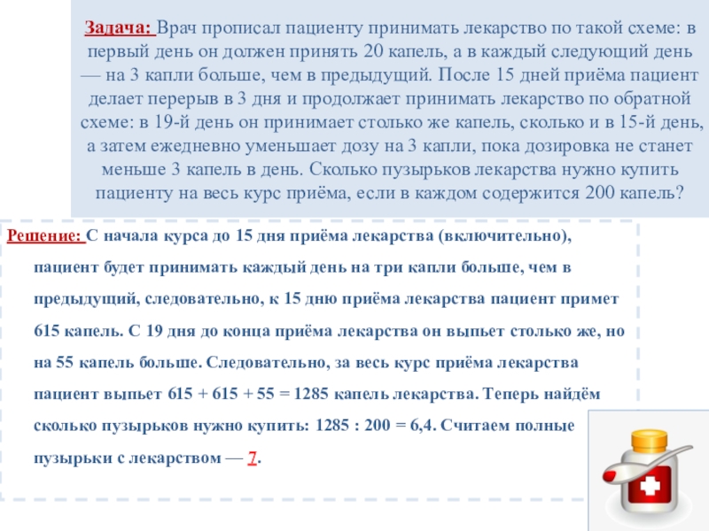 Решение: С начала курса до 15 дня приёма лекарства (включительно), пациент будет принимать каждый день на три капли больше, чем в предыдущий, следовательно, к 15 дню приёма лекарства пациент примет 615 капель. С 19 дня до конца приёма лекарства он выпьет столько же, но на 55 капель больше. Следовательно, за весь курс приёма лекарства пациент выпьет 615 + 615 + 55 = 1285 капель лекарства. Теперь найдём сколько пузырьков нужно купить: 1285 : 200 = 6,4. Считаем полные пузырьки с лекарством — 7.