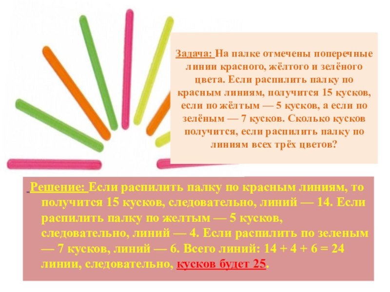 Задача: На палке отмечены поперечные линии красного, жёлтого и зелёного цвета. Если распилить палку по красным линиям, получится 15 кусков, если по жёлтым — 5 кусков, а если по зелёным — 7 кусков. Сколько кусков получится, если распилить палку по линиям всех трёх цветов?