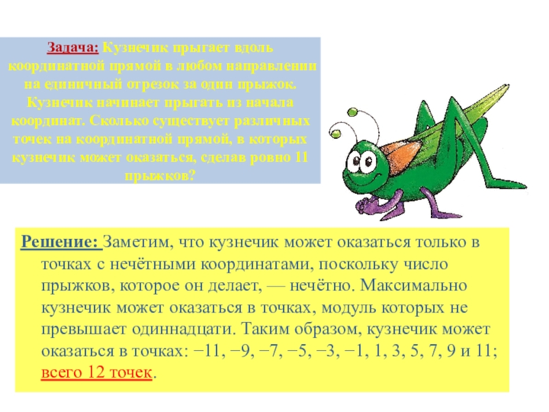 Решение: Заметим, что кузнечик может оказаться только в точках с нечётными координатами, поскольку число прыжков, которое он делает, — нечётно. Максимально кузнечик может оказаться в точках, модуль которых не превышает одиннадцати. Таким образом, кузнечик может оказаться в точках: −11, −9, −7, −5, −3, −1, 1, 3, 5, 7, 9 и 11; всего 12 точек.