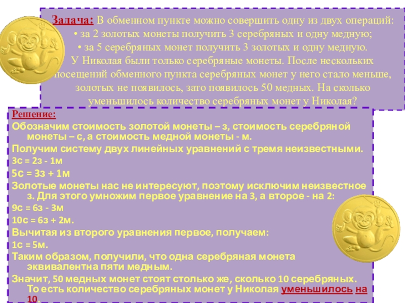 Обозначим стоимость золотой монеты – з, стоимость серебряной монеты – с, а стоимость медной монеты - м.