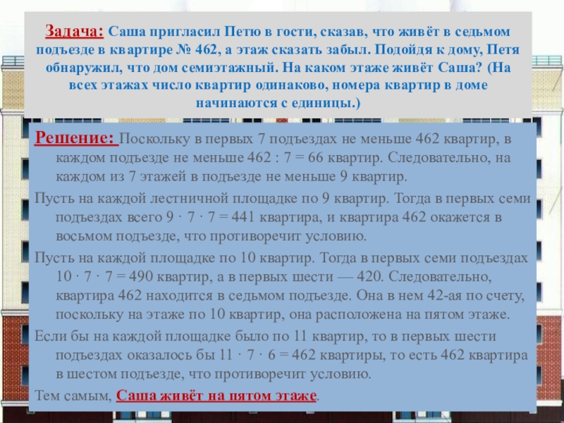 Решение: Поскольку в первых 7 подъездах не меньше 462 квартир, в каждом подъезде не меньше 462 : 7 = 66 квартир. Следовательно, на каждом из 7 этажей в подъезде не меньше 9 квартир.