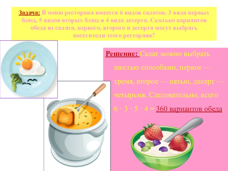 Решение: Салат можно выбрать шестью способами, первое — тремя, второе — пятью, десерт — четырьмя. Следовательно, всего 6 · 3 · 5 · 4 = 360 вариантов обеда.