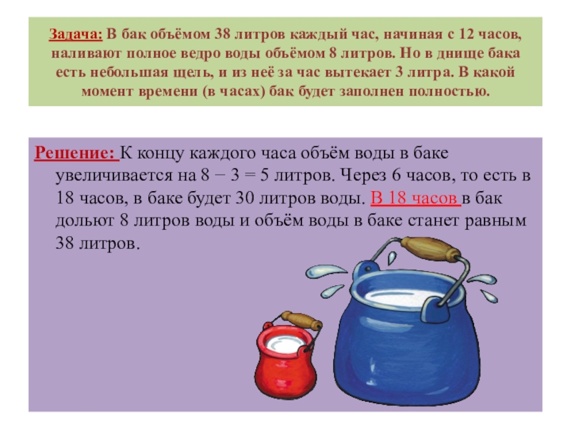 Решение: К концу каждого часа объём воды в баке увеличивается на 8 − 3 = 5 литров. Через 6 часов, то есть в 18 часов, в баке будет 30 литров воды. В 18 часов в бак дольют 8 литров воды и объём воды в баке станет равным 38 литров.