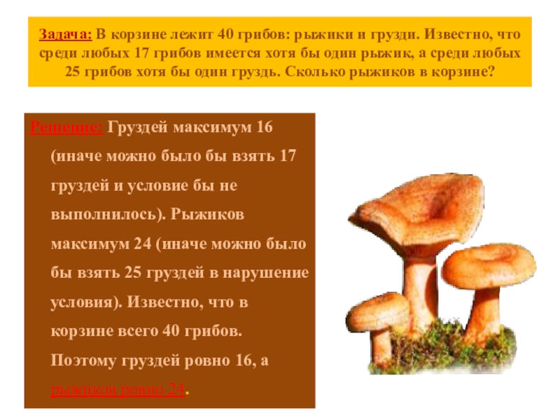 Решение: Груздей максимум 16 (иначе можно было бы взять 17 груздей и условие бы не выполнилось). Рыжиков максимум 24 (иначе можно было бы взять 25 груздей в нарушение условия). Известно, что в корзине всего 40 грибов. Поэтому груздей ровно 16, а рыжиков ровно 24.