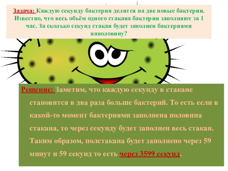 Решение: Заметим, что каждую секунду в стакане становится в два раза больше бактерий. То есть если в какой-то момент бактериями заполнена половина стакана, то через секунду будет заполнен весь стакан. Таким образом, полстакана будет заполнено через 59 минут и 59 секунд то есть через 3599 секунд.