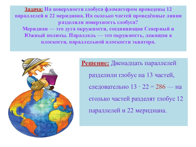 Решение: Двенадцать параллелей разделили глобус на 13 частей, следовательно 13 · 22 = 286 — на столько частей разделят глобус 12 параллелей и 22 меридиана.