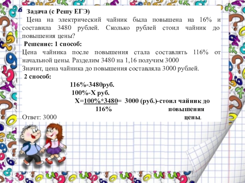 Цена чайника после повышения стала составлять 116% от начальной цены. Разделим 3480 на 1,16 получим 3000