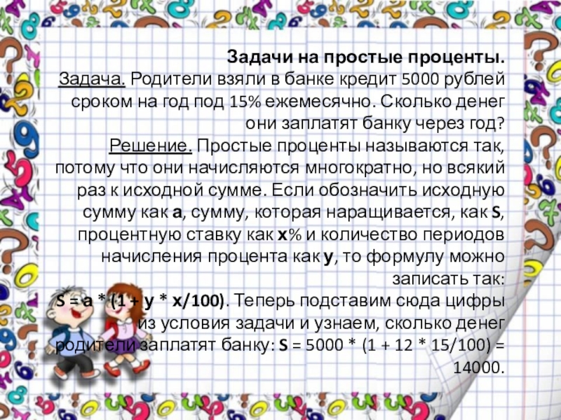 S = а * (1 + у * х/100). Теперь подставим сюда цифры из условия задачи и узнаем, сколько денег родители заплатят банку: S = 5000 * (1 + 12 * 15/100) = 14000.