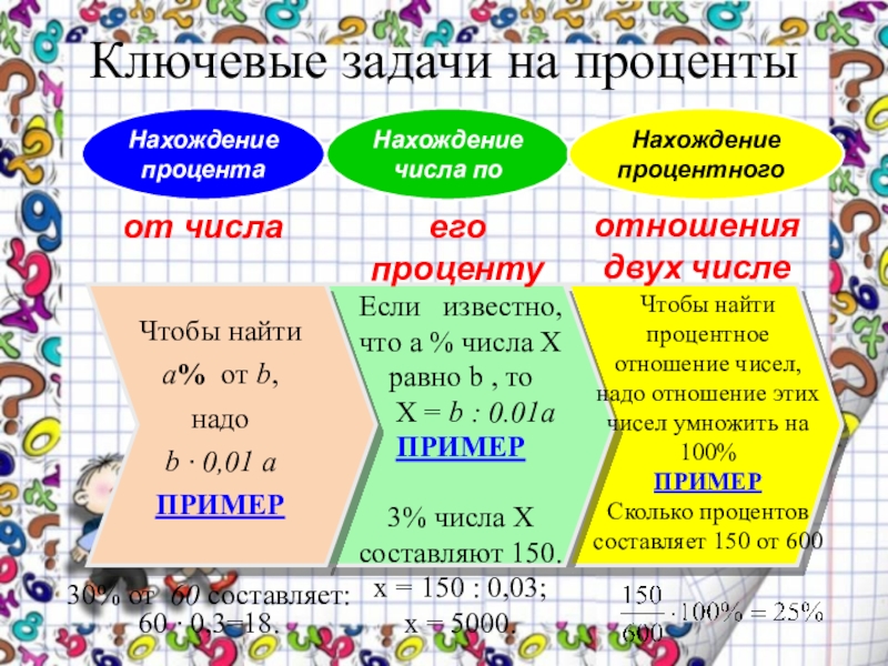 Слайд 7Ключевые задачи на проценты