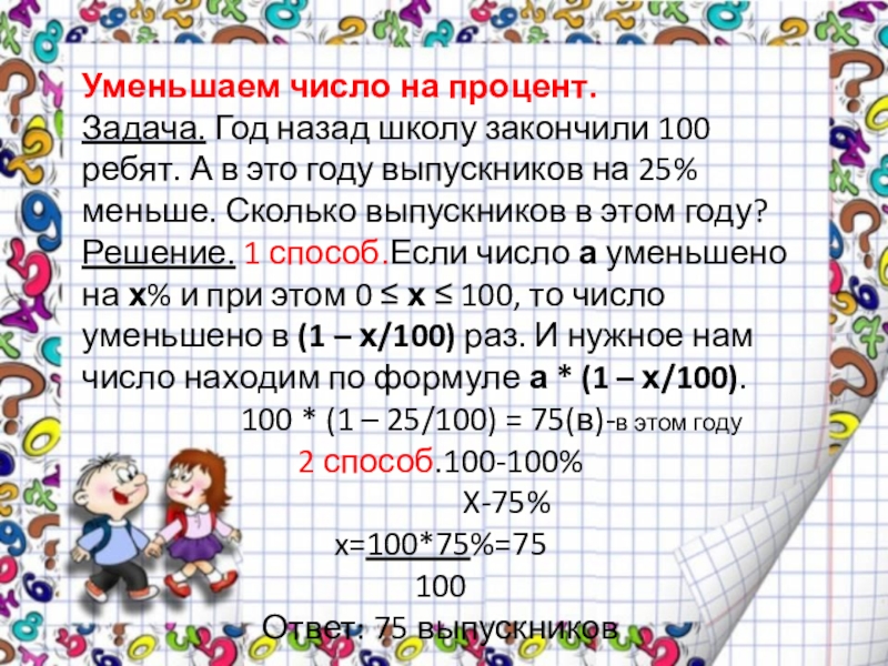 Решение. 1 способ.Если число а уменьшено на х% и при этом 0 ≤ х ≤ 100, то число уменьшено в (1 – х/100) раз. И нужное нам число находим по формуле а * (1 – х/100).