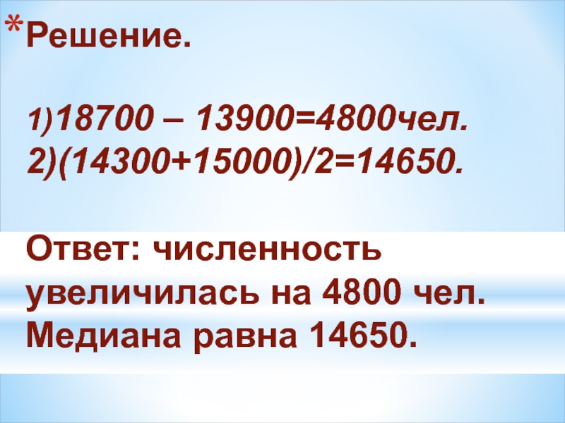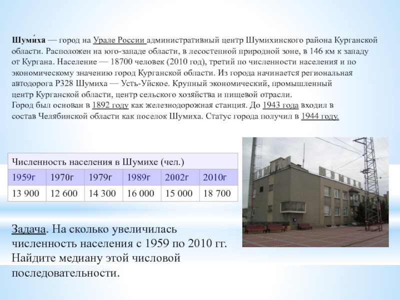 Задача. На сколько увеличилась численность населения с 1959 по 2010 гг. Найдите медиану этой числовой последовательности.