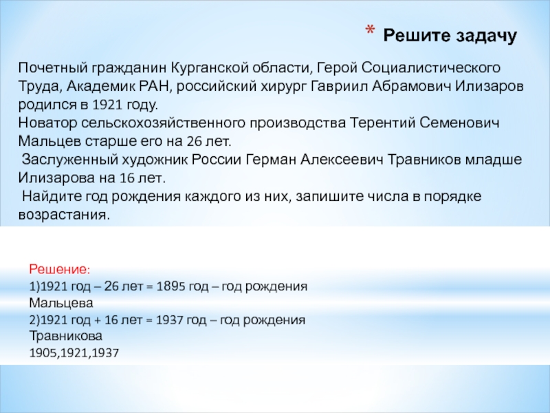 1)1921 год – 26 лет = 1895 год – год рождения Мальцева