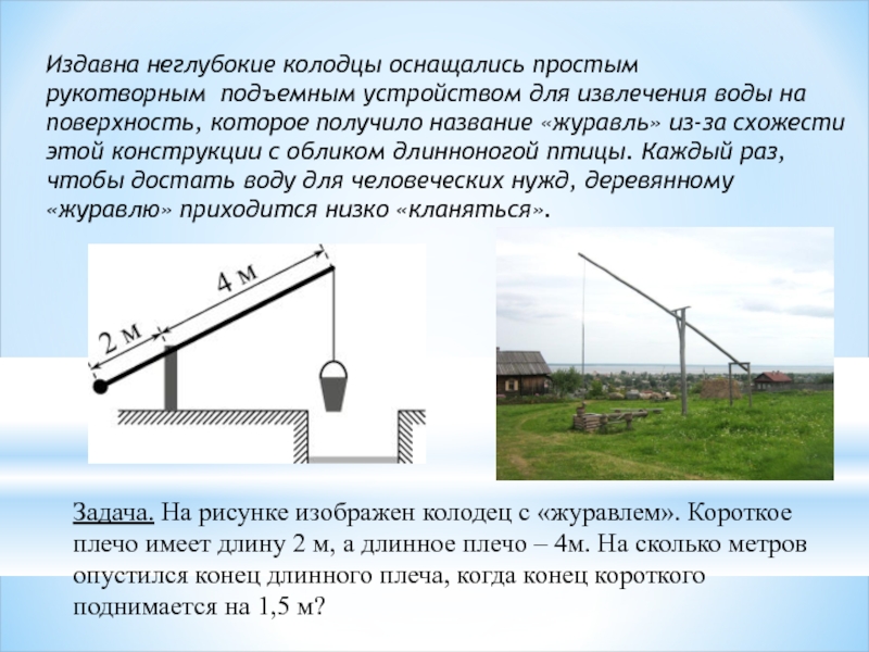 Задача. На рисунке изображен колодец с «журавлем». Короткое плечо имеет длину 2 м, а длинное плечо – 4м. На сколько метров опустился конец длинного плеча, когда конец короткого поднимается на 1,5 м?