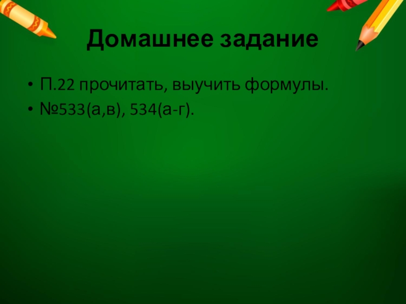 Домашнее заданиеП.22 прочитать, выучить формулы.№533(а,в), 534(а-г).