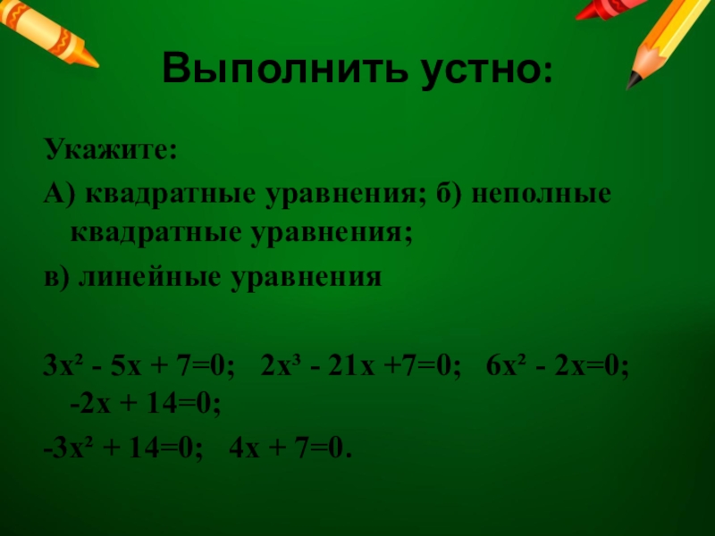 Выполнить устно:Укажите: А) квадратные уравнения; б) неполные квадратные уравнения; в) линейные уравнения3x² - 5x + 7=0;