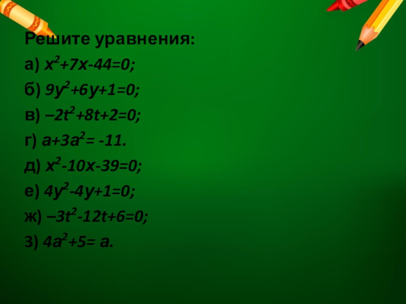 Решите уравнения:а) х2+7х-44=0;б) 9у2+6у+1=0;в) –2t2+8t+2=0;г) а+3а2= -11.д) х2-10х-39=0;е) 4у2-4у+1=0;ж) –3t2-12t+6=0;3) 4а2+5= а.