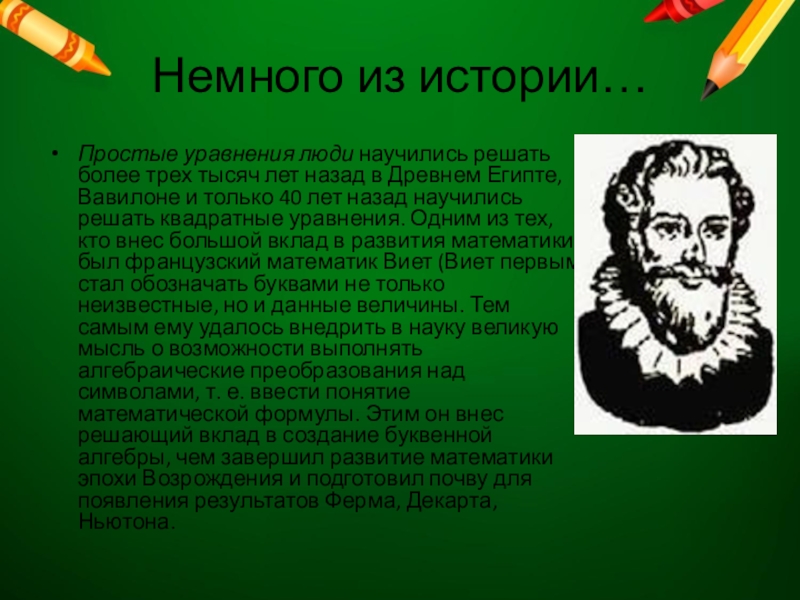 назад в Древнем Египте, Вавилоне и только 40 лет назад научились решать квадратные уравнения. Одним из тех, кто внес большой вклад в развития математики, был французский математик Виет (Виет первым стал обозначать буквами не только неизвестные, но и данные величины. Тем самым ему удалось внедрить в науку великую мысль о возможности выполнять алгебраические преобразования над символами, т. е. ввести понятие математической формулы. Этим он внес решающий вклад в создание буквенной алгебры, чем завершил развитие математики эпохи Возрождения и подготовил почву для появления результатов Ферма, Декарта, Ньютона.