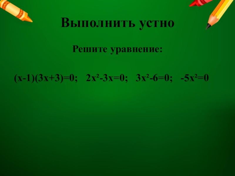 Выполнить устноРешите уравнение:(x-1)(3x+3)=0;  2x²-3x=0;  3x²-6=0;  -5x²=0