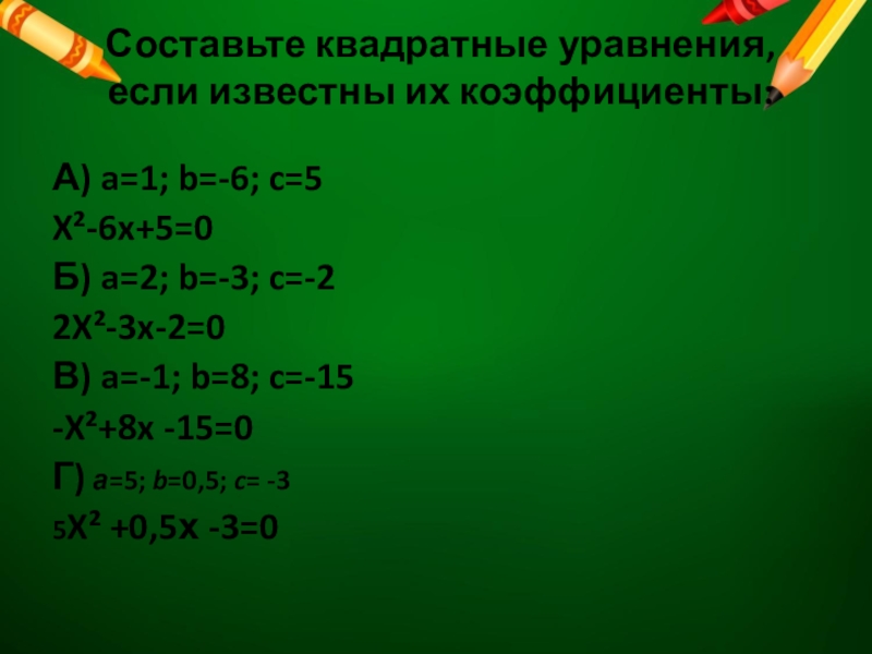 Слайд 6Составьте квадратные уравнения, если известны их коэффициенты: