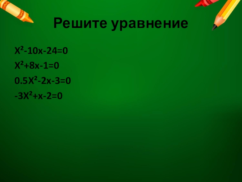 Решите уравнениеX²-10x-24=0X²+8x-1=00.5X²-2x-3=0-3X²+x-2=0