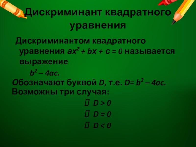 b2 – 4ac. Обозначают буквой D, т.е. D= b2 – 4ac. Возможны три случая: