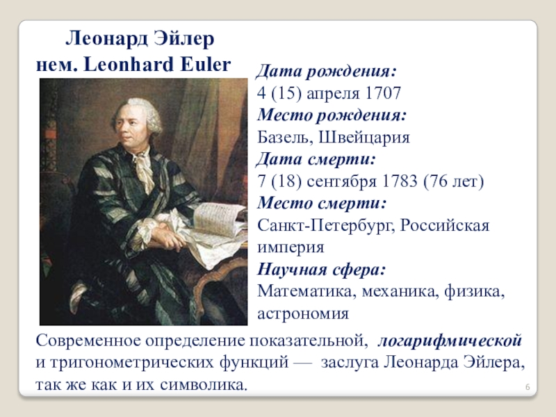 Современное определение показательной, логарифмической и тригонометрических функций — заслуга Леонарда Эйлера, так же как и их символика.