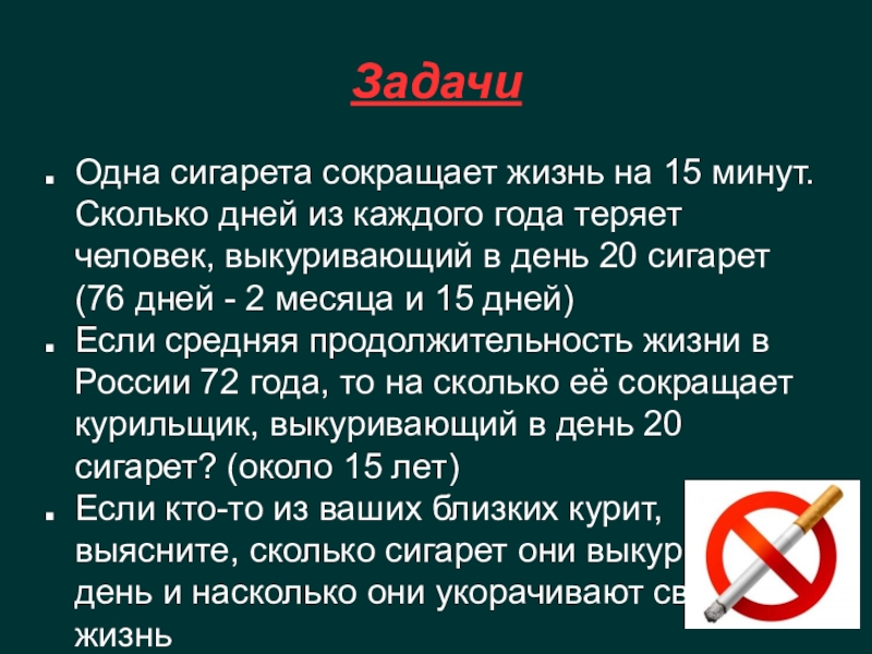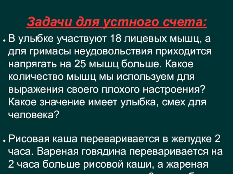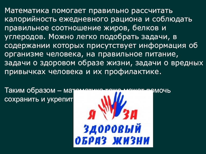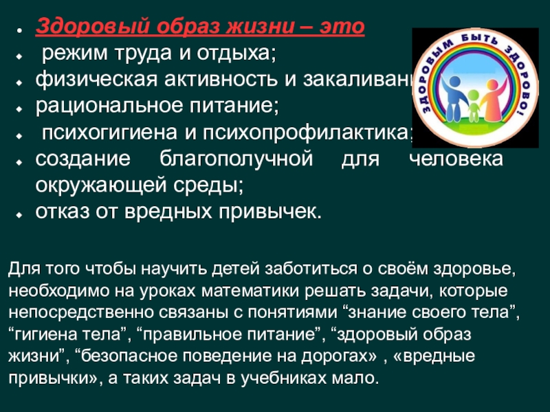 Для того чтобы научить детей заботиться о своём здоровье, необходимо на уроках математики решать задачи, которые непосредственно связаны с понятиями “знание своего тела”, “гигиена тела”, “правильное питание”, “здоровый образ жизни”, “безопасное поведение на дорогах» , «вредные привычки», а таких задач в учебниках мало.
