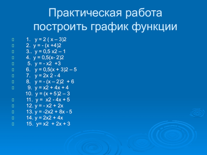 Практическая работа (17 мин)Задание.  Построить графики различных квадратичных функций.Для этого надо: Выбрать из 15 данных уравнений