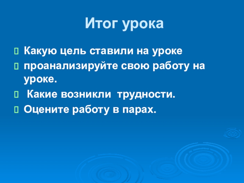 Итог урокаКакую цель ставили на уроке проанализируйте свою работу на уроке. Какие возникли трудности. Оцените работу в
